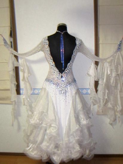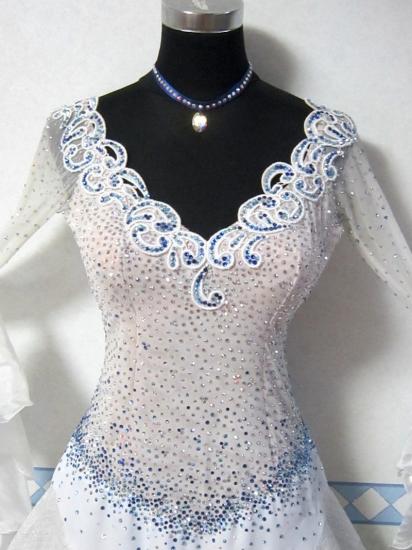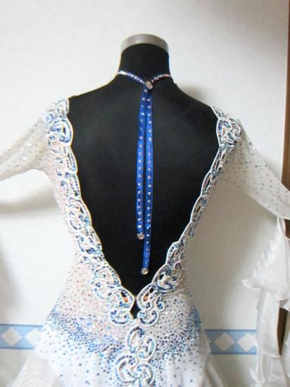上半身はストレッチネット、スカートはジョーゼットのインナースカートの上にオーガンジーとシルバーのラメのストライプのシルク混の生地が何枚にも重なってボリュームのある今流行のスカートになっています。裾はホースヘア。 ストーンはスワロフスキーの大小さまざまなサイズのオーロラ、ブルー系の石を数色、合計約45グロス使用されており大変豪華なドレスです。ドレスは半年使用後イタリアのアトリエで石の補修、クリーニングなどすべて手入れを済ませており大変良い状態です。Lサイズで身長の低い方に合うイタリア製のドレスはなかなかありませんので、大変希少価値のあるドレスです。附属品:ネックレス、キモノ(新品、色指定は不可)、ケース(ロング衣装ケース、大バッグ、小バッグ計3個)をおつけします。