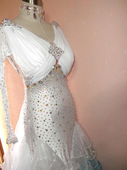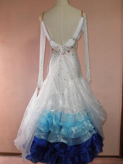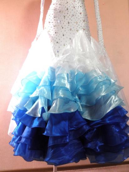 全身大量ストーンを使用し、スカートはたぷっりボリュームがあって白?水色?濃い青のぼかしがとても魅力的です。とてもお得なドレスです。