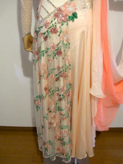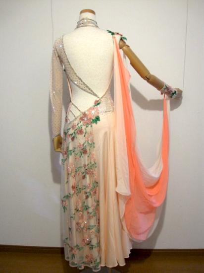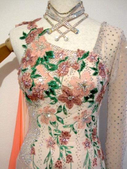 淡いピンクに花柄のとても可愛いドレスです。ボディと左袖にたくさんのクリスタルが敷き詰められておりエダスーらしい豪華で繊細なデザインとなっています。また、右肩から手首にかけてオレンジをアクセントとした大きなフロートが付いていて良く舞います。付属品としてイヤリングと首飾りが付きます。クリーニング済み。