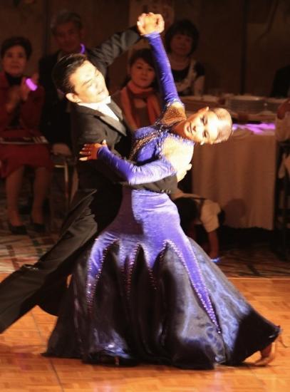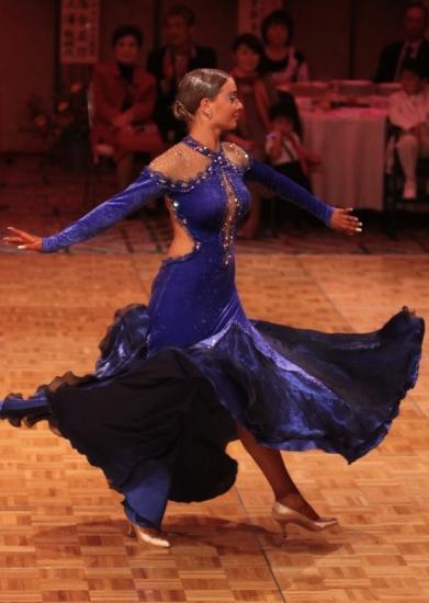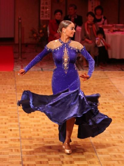 ロイヤルブルーのとてもフロア映えするドレスです。ボディの真ん中、肩と肩甲骨の上あたりまではベージュの生地に覆われており、その上にスワロフスキーが沢山ついています。ウエストの部分は露出しています。スカートは軽く、とてもよく舞います。フロートはありません。