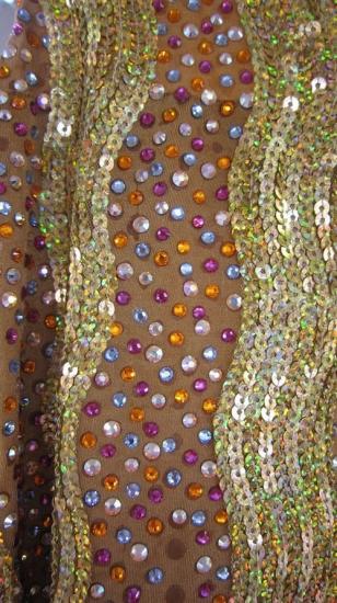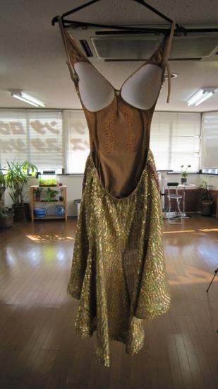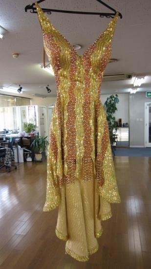 スパン生地がとてもきらきらして目につくドレスです。カラフルなストーンが沢山ついています。スカートは前はフリンジで、後ろは長くなっていて、踊りに合わせて動きます。