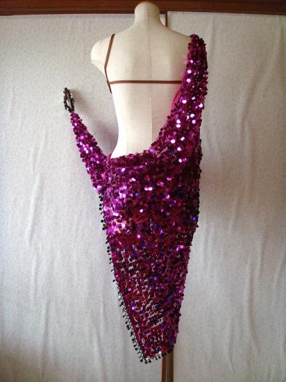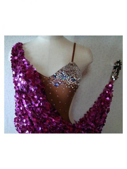 胸元には石がついていて煌めきます。スパン生地が腕から繋がっているので、大きく見えます。