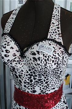 ドレスはフォイルプリント加工された光沢のあるダルメシアン柄の布で作られています。