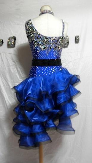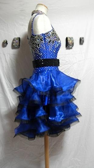 ボディーにたくさんのラインストーン使用してありとても豪華なドレスです。スカートもボリュームがたっぷりあり、よく踊ります。ベルトを外しても豪華なドレスです。チョーカー、腕輪4つ、ベルト、予備ラインストーン付きです。