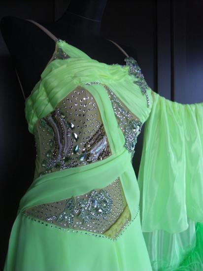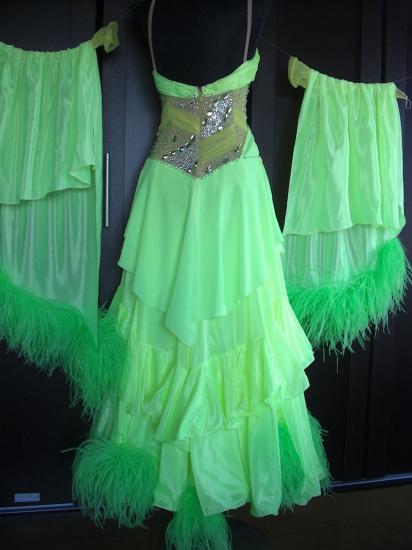 ソーオンなどの縫い付けストーンがいっぱいのオーストリッチの羽がゴージャスなドレスです。競技会などでもかなり目を引く蛍光色大きめのフロートも素敵なドレスです。アンダースカートに少し汚れがありますがお召しになるにはほとんど気にならないと思います。着用時間も短くとても綺麗なドレスですが、汚れということでお安く出品いたします。