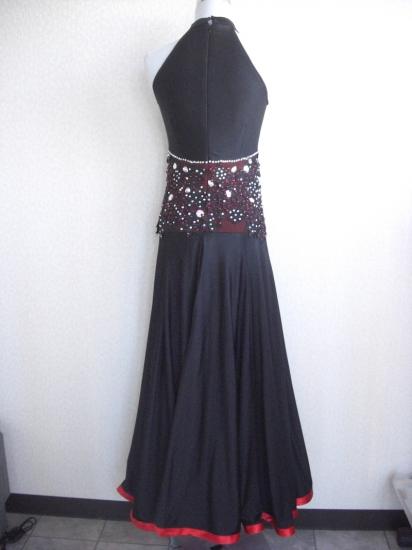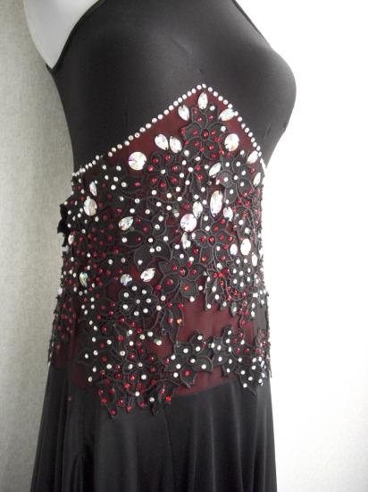 長いスリットと赤で2重になったスカートがパソやアルゼンチンタンゴなどに素敵なドレスです。なかなか気に入るドレスがなくこちらを購入してパソ向けにややスカートのラインをシャープにし、大きいソーオンやスワロをたくさん足して装飾いたしました。とても評判の良いドレスです。黒のレースの手袋と赤の小さめスカーフをお付けいたします。
