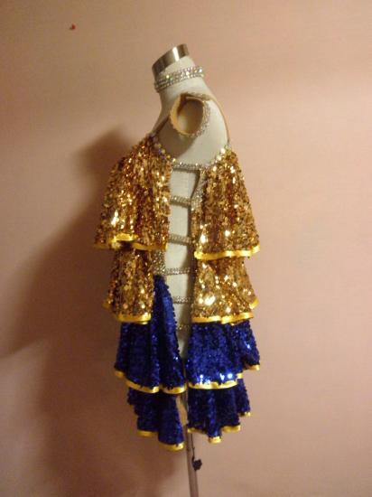 GOLDとロイヤルブルーの段々スパンコールがゴージャスなドレス。黄色のラインも効いていて、ラインストーンで全体が飾られており、非常に光り輝きます。ネックレス、アームバンド、予備用ストーンを付けします。