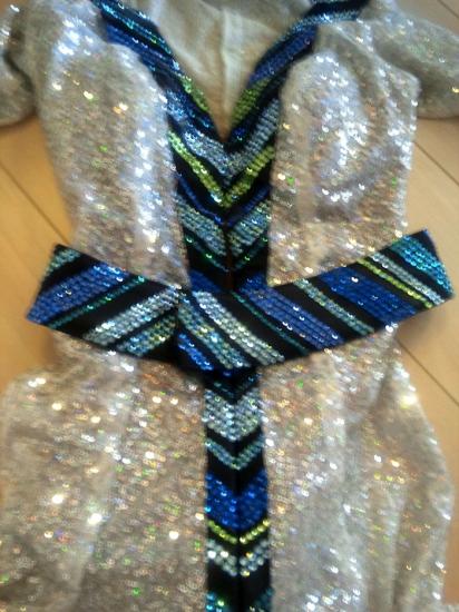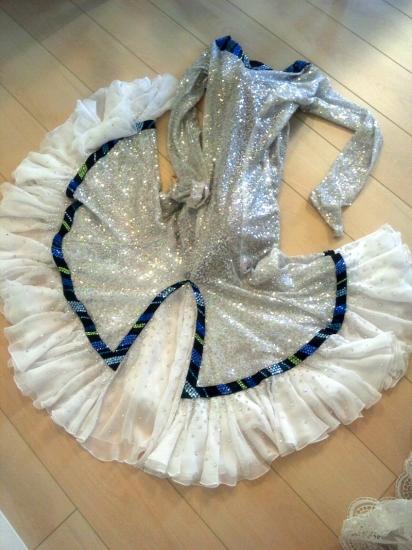 ワンピース型のラテンドレスです。エレガントで女性らしい雰囲気です。緑のラインが効いています。スカートの布の分量がとても多く、よく踊ります。