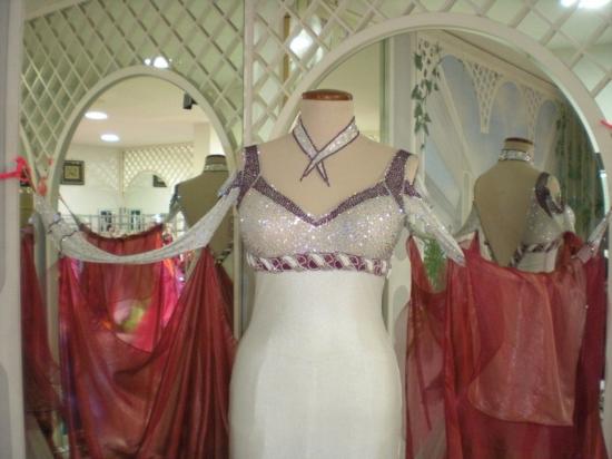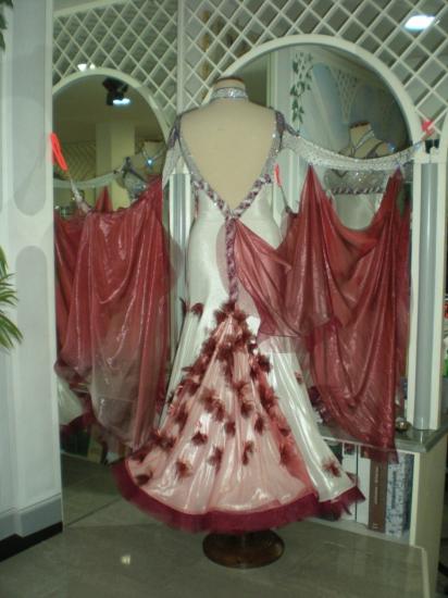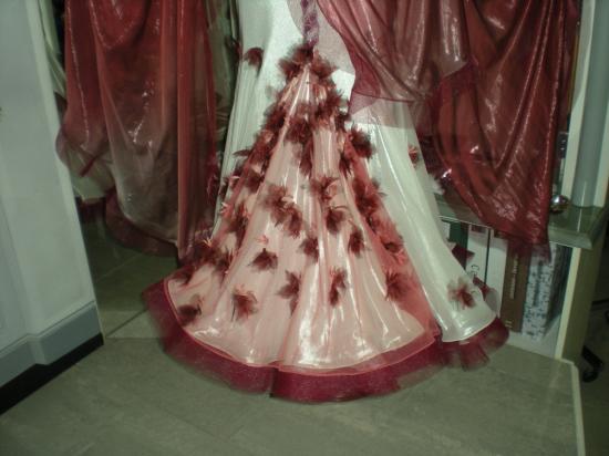 Centini Alta Modaのニューコレクションとして作製されたドレスです。上半身はシルバーがかったパールのストレッチ素材、スカートはパールのような光沢のあるリキッドジョーゼットとオーガンジーを使用しています。バックの三角形の部分はチュールの上にワインレッドのお花を散らしてあり後姿も非常に個性的です。バストの下と背中のYの字につけられているモチーフテープはバレンチノのオートクチュールのものを利用しています。フロートも左側は腕を通して前後に2枚たれるようになっていて大変良く舞います。。ストーンはスワロフスキーを約5000個、縫い付け石を約30個使用しています。ドレスは一度使用されただけですが、イタリアのアトリエで石の補修などすべて手入れを済ませており大変良い状態です。附属品:ネックレス、イヤリング、ヘアアクセサリー、キモノ(新品、色指定は不可)、衣装ケース(ロング衣装ケース、大バッグ、小バッグ計3個)をおつけします。