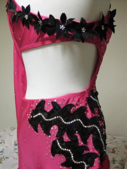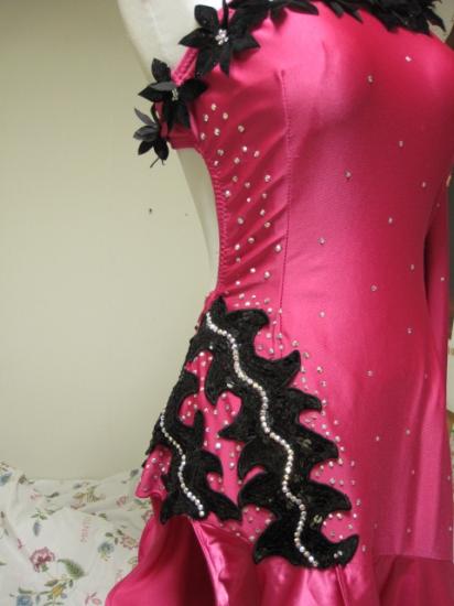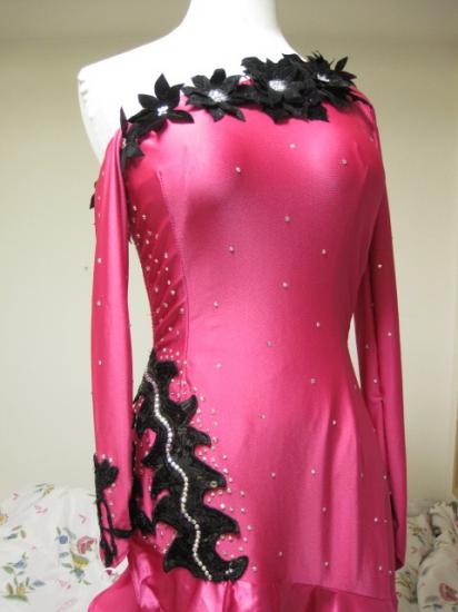 胸元の黒い花と、右腰の黒スパンのモチーフがポイントです。
