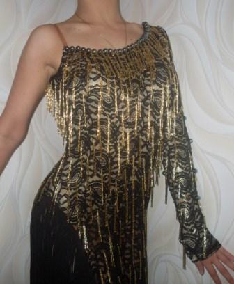 黒ベースにゴールドの飾りがゴージャスで、右肩が空いた斜めのシルエットが綺麗です。