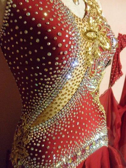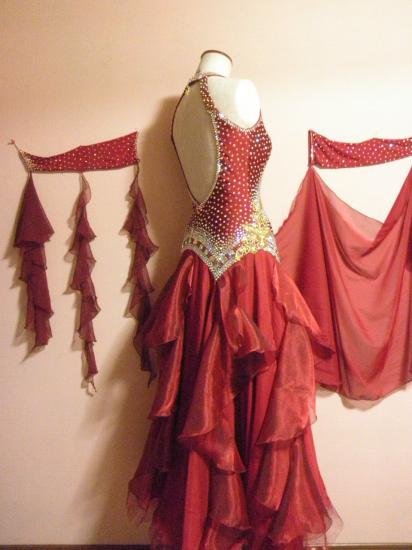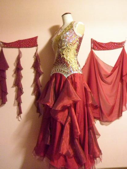 ワインレッドの上にGOLD色のモチーフレースを使って良く目立ちなドレスです。スカートのフリルが踊るととてもよく舞います。とにかくとても軽やかなドレスです。ネックレス、手袋、ドレスカバー付きです。