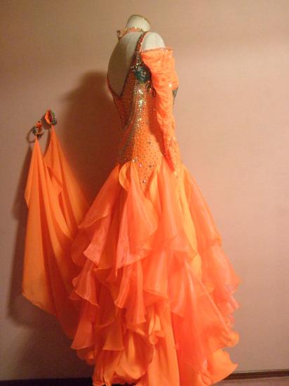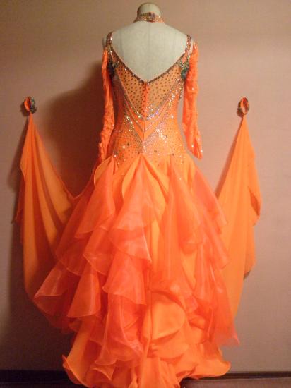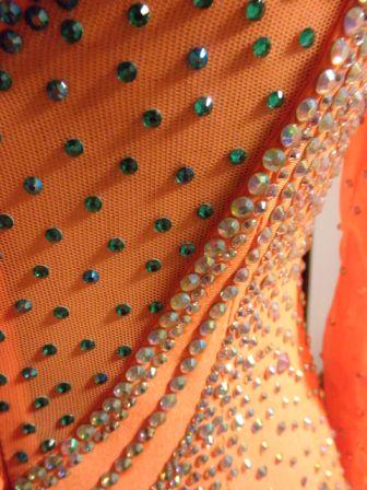 胸元は大きな花柄の刺繍とストーンの組み合わせがとても目立って美しいです。スカ ートはボリュームがあり、 軽くよく踊ります。全身ぎりぎりまでプレシオサのオーロララインストーンがたくさんついています。