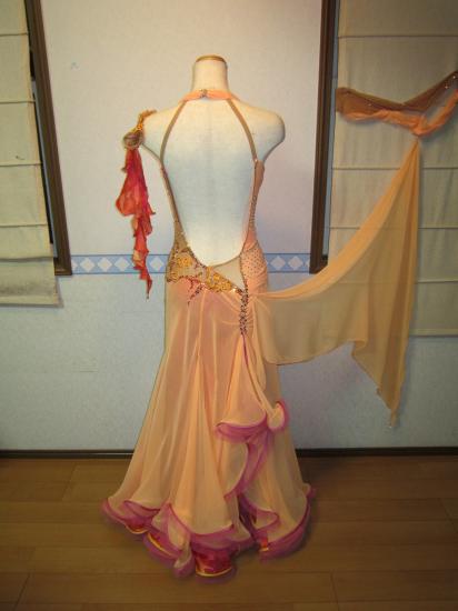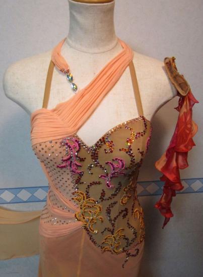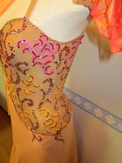 トップは薄いオレンジ色のストレッチネット、スカートは上から薄いオレンジ色のジョーゼット、シルク紺プリント地、ピンク色ジョーゼットの3枚重ねです。上の2枚に関してはバックに切り込みが入っており、スカートが踊ると中のプリント地が見えるようになっています。何色ものカラフルなスワロフスキーストンが使用されています。ドレスは1年程度使用されておりますが、イタリアのアトリエで石の補修、クリーニングなどすべて手入れを済ませておりますので大変お買い得価格です。 このドレスは168-175位の背の高い方に適しております。ロングドレスカバーはお付けします。Centini Alta Moda のM794〜M803のドレスは同時に2着まで試着可能です。