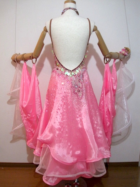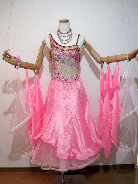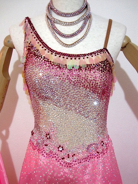 ボディ、スカート、ネックレス、腕輪と、至る所にスワロフスキーがびっちり貼ってあり、非常に豪華で、キュートなドレスです。軽くて踊りやすいドレスです。ネックレス、イヤリング(花のレースモチーフ)、ピアス(大粒ストーン)、メンテナンス用のスワロフスキーストーン、ビーズレースがついています。