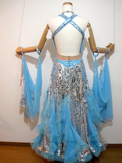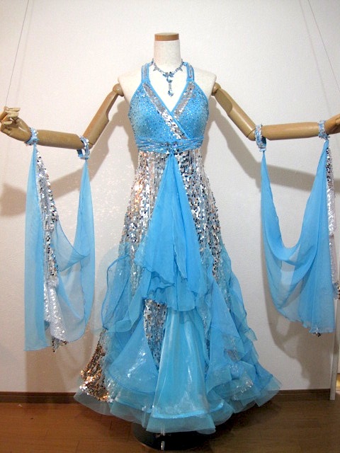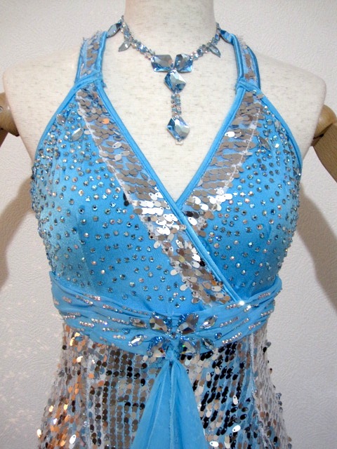 ハイウエストのとてもデザインが素敵なドレスです。スカートは3枚で、一番上がスパンコールの生地になっていて、とても輝きます。インパクトがあり、でも神秘的で個性的なドレスです。ネックレス、ピアス付き。
