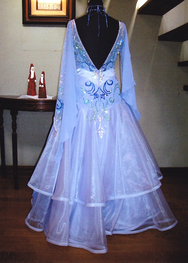 さわやかな色合いで形も非常にエレガントなドレスです。石取れはほとんどありません、2段になっていますのでとても軽く、スカート裏には少し濃い色のジョウゼットかついています、インナー付。