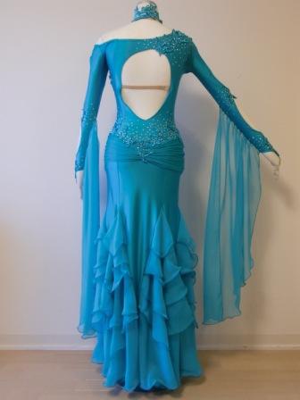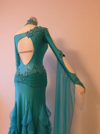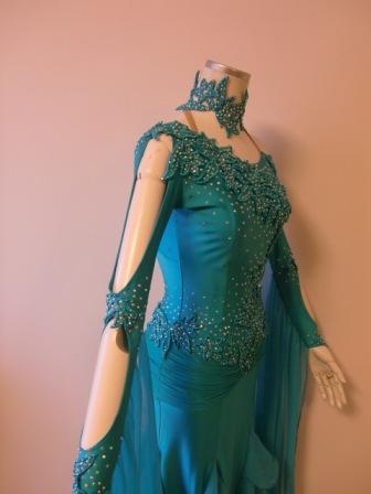 ターコイズグリーンのスレンダーなシルエットのドレスです