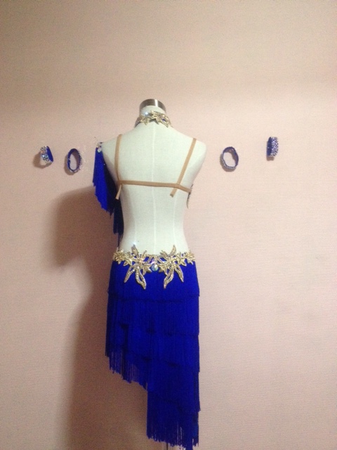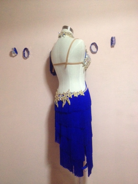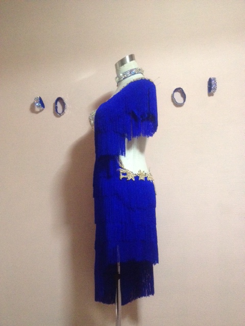 ロイヤルブルーのロングフリンジドレスです。胸元とバックのスタイルには沢山のラインストーンが敷き詰めてありとても輝きます。チョーカ ー、アーム、リストバンドが付きます。