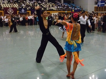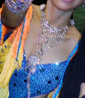フリンジ素材で出来ているため、ドレス自体がよく踊り、小柄な方にも向いています。色も青とオレンジで他の人とまず被らないため、競技会においてもとても目立ちます。ネックレスやドレスに石が沢山付いているため照明があたった時に光ってくれます。バングル(両手)、イヤリング付きです。