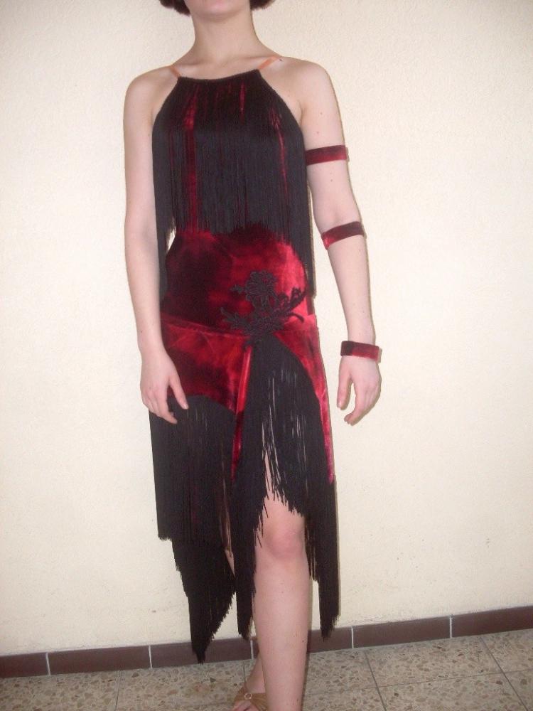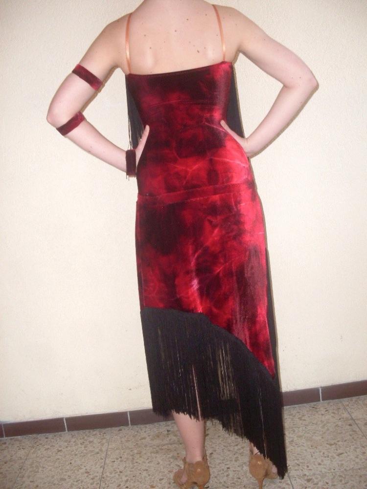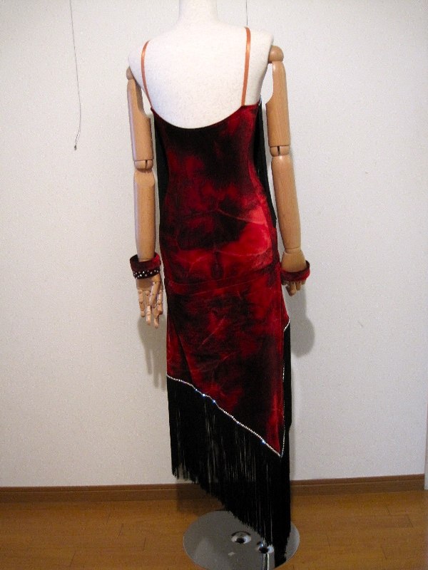 ワインレッドのマーブル柄のベルベットに黒フリンジがよく踊るドレスです。