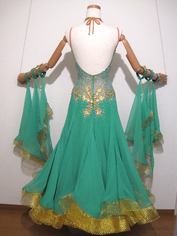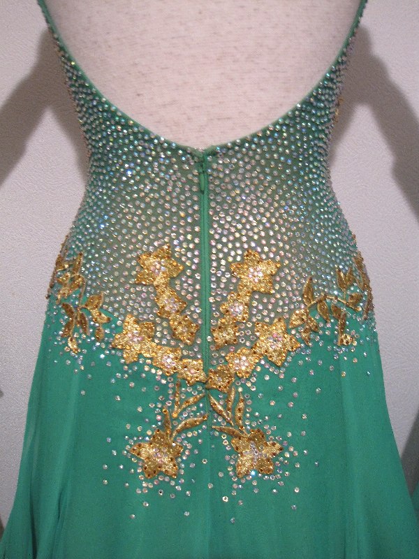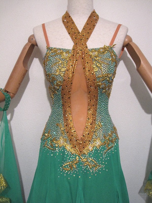 鮮やかなグリーンにゴールドが映えるとても美しいドレス。これからのシーズンにぴったり!