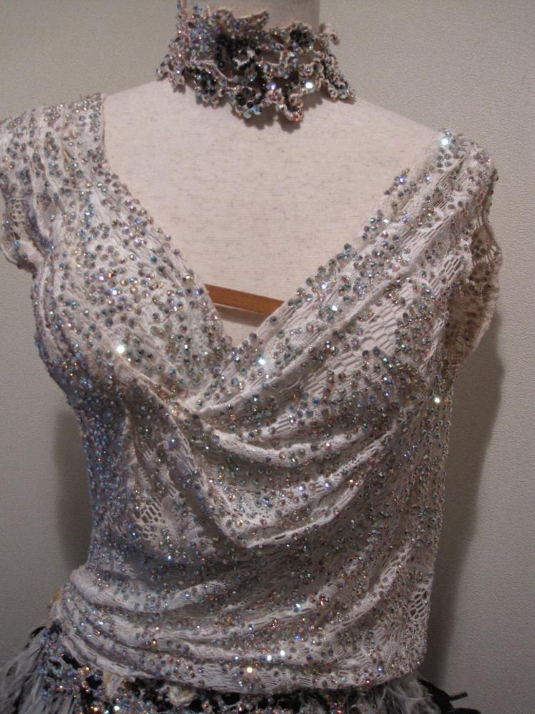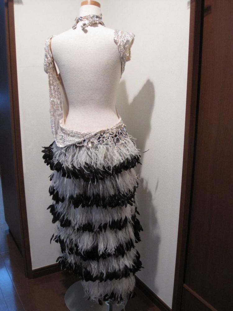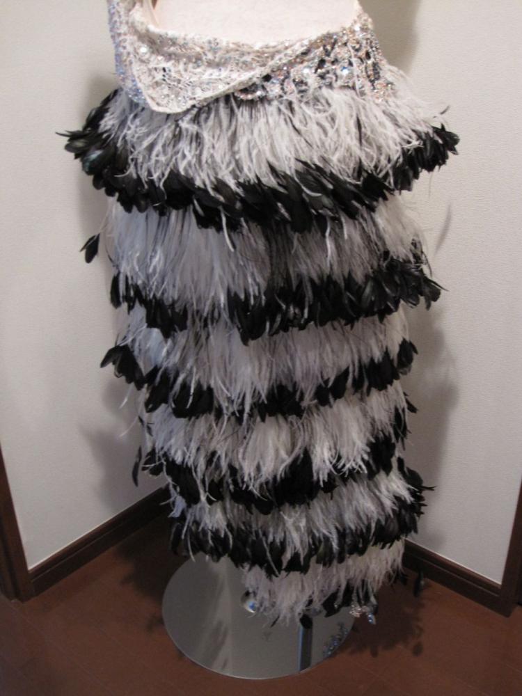 豪華な白と黒のドレス、オーロラが前後にびっしりで、黒い羽が白いドレスにとても映えます。30万円で購入。