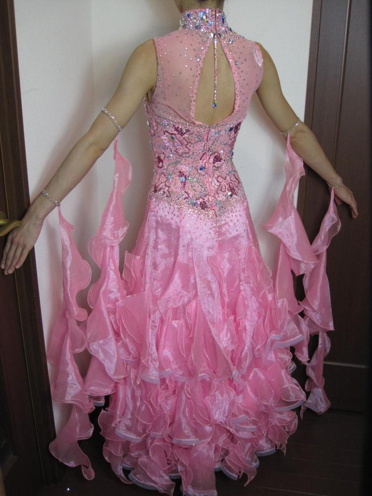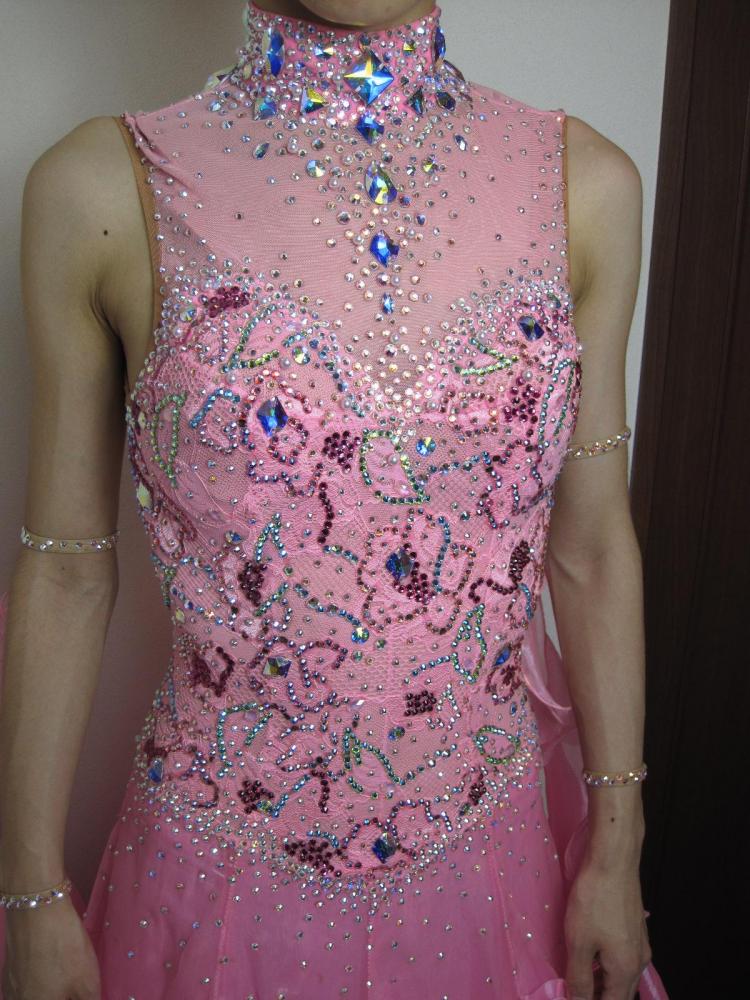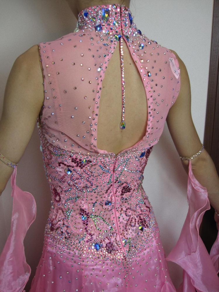ピンクのフリルがかわいいドレスです。ボディはスワロフスキーが沢山ついています。チャックがあまり下がらず、履くときがキツいので、細身の方でないと難しいと思いますが、入ってしまえば、キツくは無いと思います。