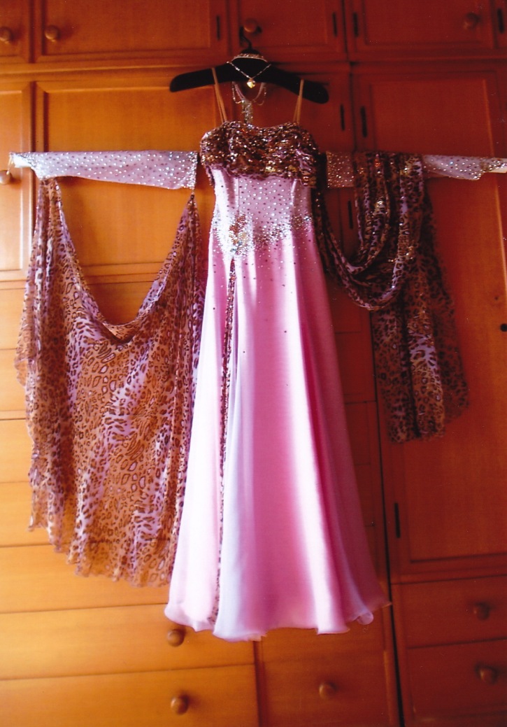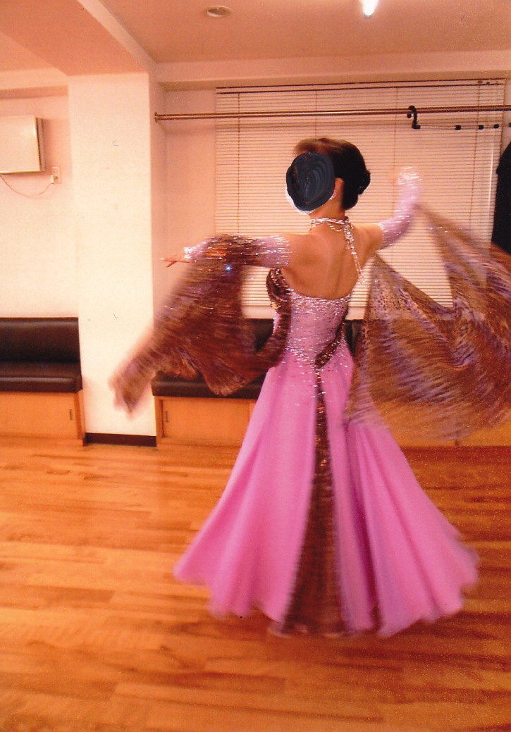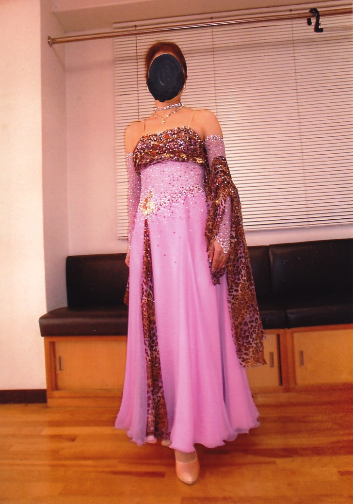 藤色がかったピンクにうっすら豹柄が入り背が高くスタイル良く見えます。上半身、そで、フロートにスワロスキーが輝きます。裾もよく踊ります。スカートは3枚で内側の2枚はピンク、3枚目に藤色のジョーゼットが重ねられているため光やライトが当たるとピンクですが、実物は写真より藤色っぽいです。上品できれいな色です。