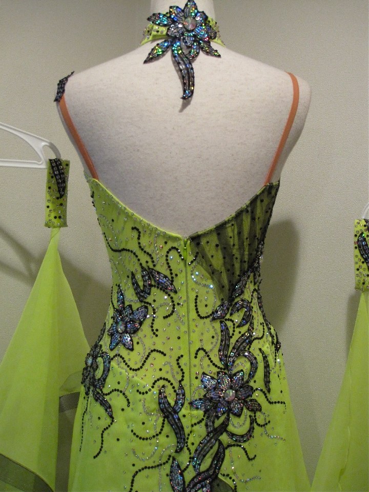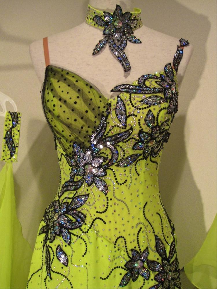 鮮やかなライムイエローに黒が映えるドレスです。モチーフの付け方により、とてもほっそりとスタイルよく見えます。スカートも3枚(内1枚は下半分が2枚に分かれています。)のジョーゼットで、軽くよく踊ります。