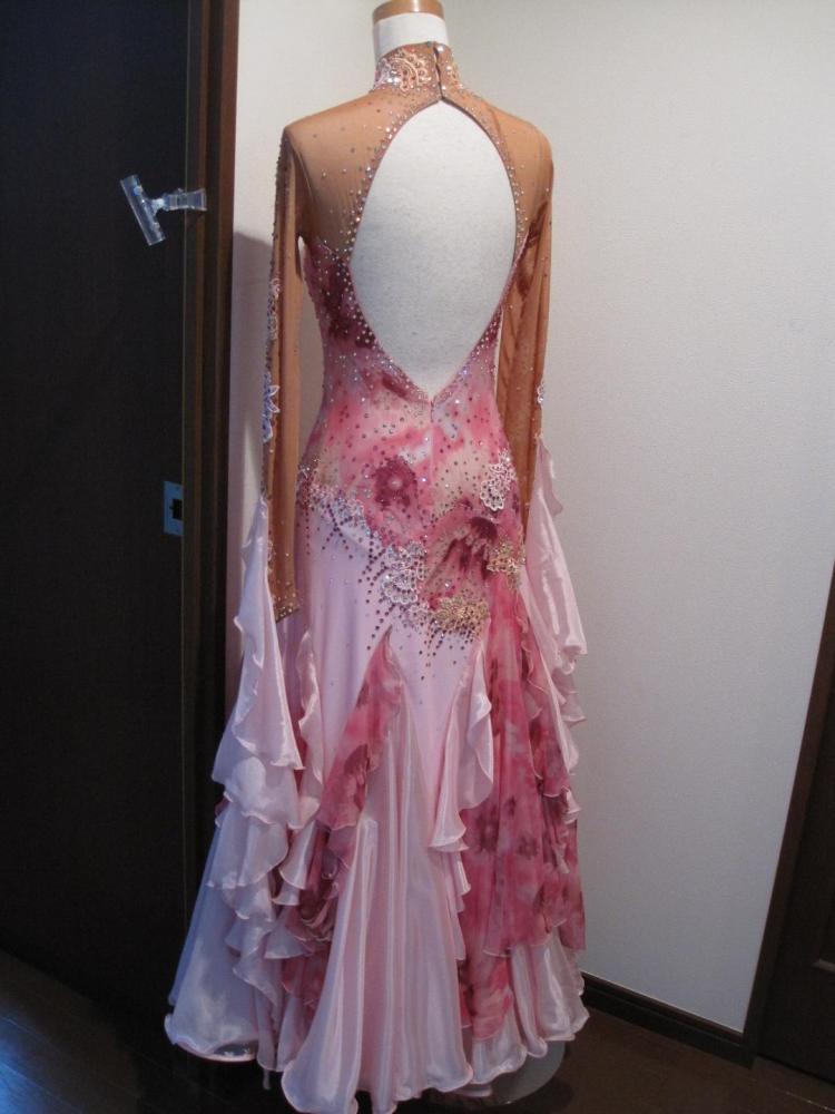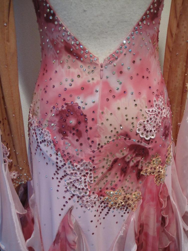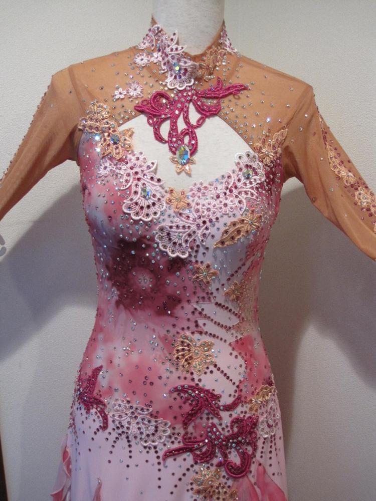 部分的に花柄プリントが入ったピンクのモダンドレスです。スワロフスキーのストーンが多く使われていて、石落ちもなく綺麗な状態です。
