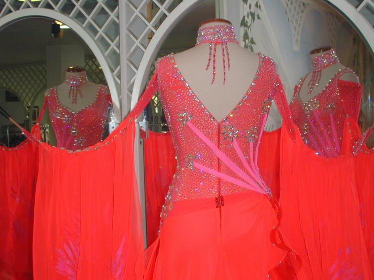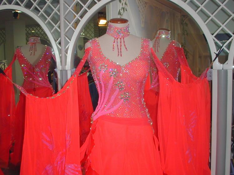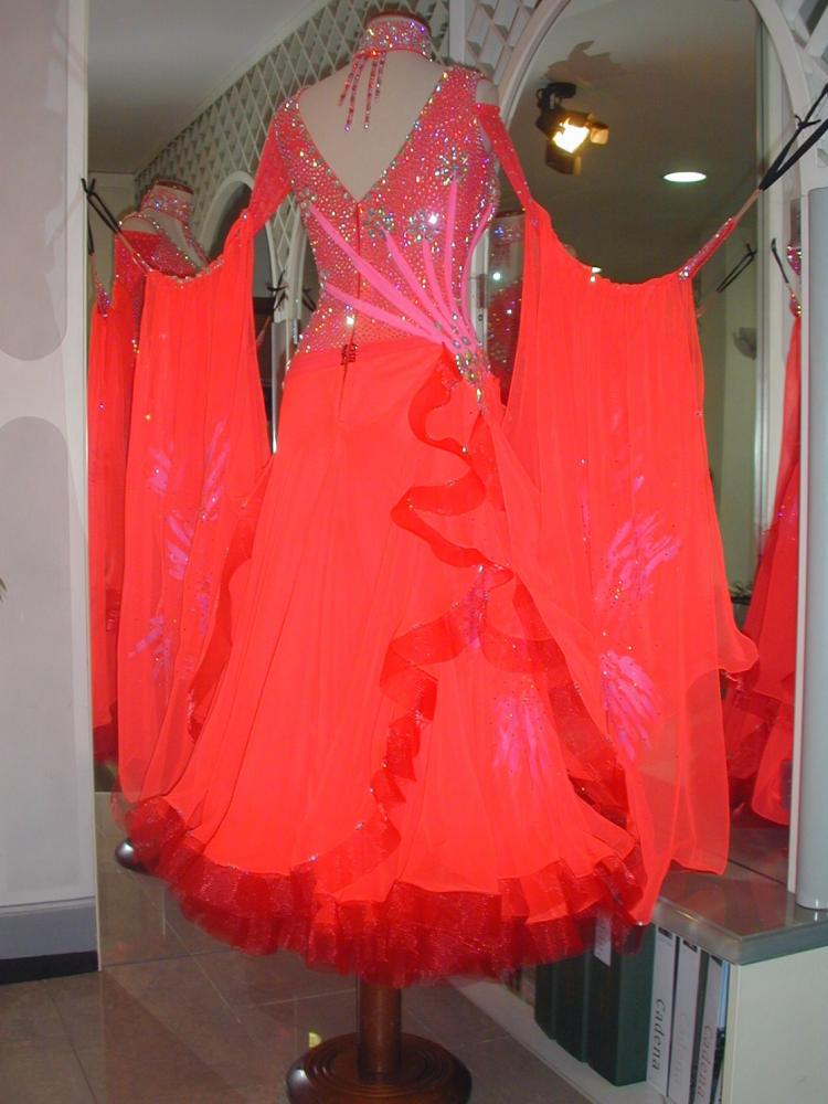 大変発色の良い鮮やかなフレームレッドのイタリア製生地を使ったドレスです。ボディーを埋め尽くすスワロフスキーのラインストーンで上半身がとても輝くドレスです。またフロートとドレスのサイドに手描きのデザインをほどこしており非常にユニークなデザインのドレスでで、競技のフロアでは大変目立つドレスです。背中はかなり上までおおわれておりますので露出度を抑えたい方にもおすすめです。スカートは1枚目〜3枚目がジョーゼット、4枚目がオーガンジーとなっており、大変軽くとてもよく踊るドレスです。是非本物のイタリアのドレスをお試し下さい。附属品:ドレスケース、キモノ(新品色指定不可)
