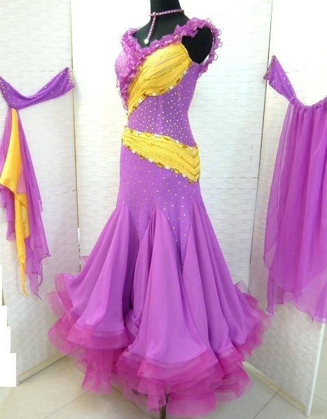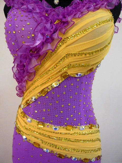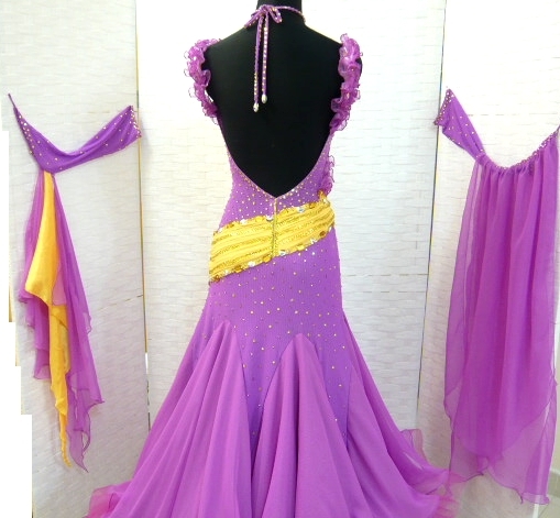 胸元がフリルで飾られていて可愛らしいドレスです。紫と黄色のコントラストがよく映えます。クリスアンの生地とスワロフスキーのストーンが使われています。