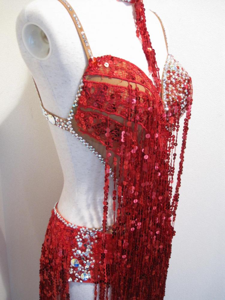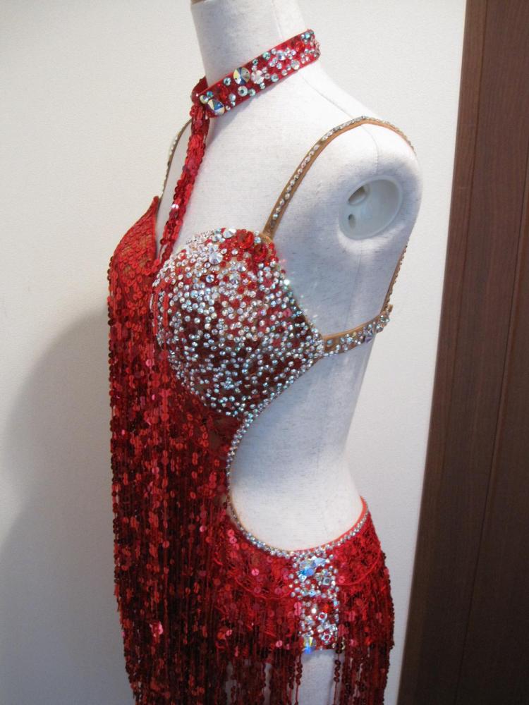 赤のスパンコールフリンジのドレスです。胸元と腰には石がびっしりと貼られていてそれがサイドから覗いて見えます。