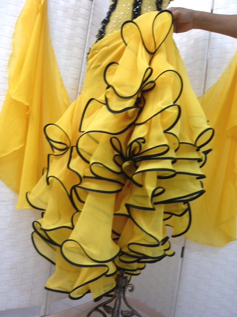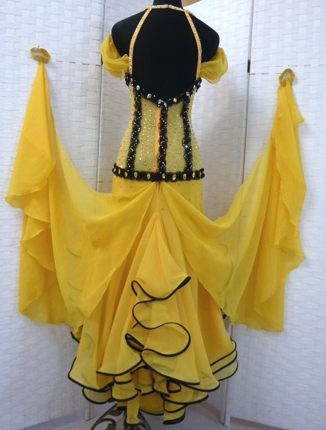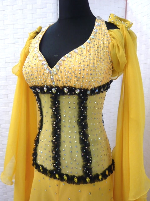 黄色に黒のラインが入ったドレスです。胸元から腰の半分くらいまでで黒の切りかえが入っており、縦に何本か黒のラインがあるのでとてもスタイルよく見せてくれます。