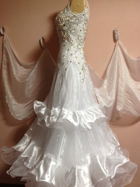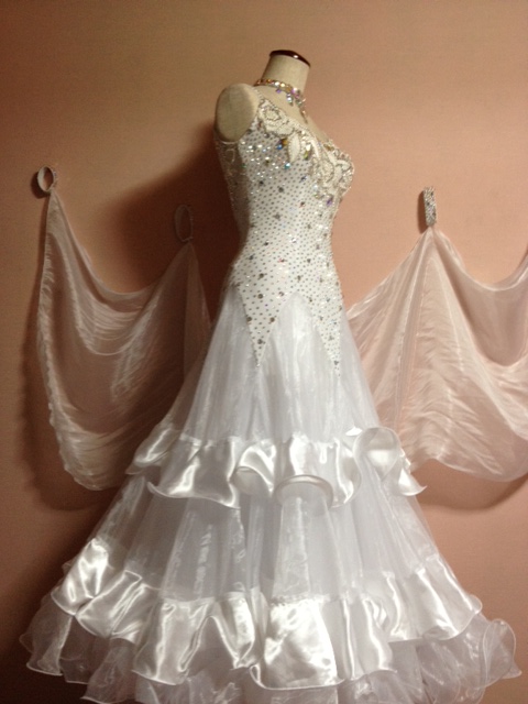 全身はたくさんスワロスキーとプレシオサ社製ラインストーンを使用し、白いモチーフレースとうまく合わせて完成しました。スカートは4層で、三枚目までオーガンジー、4層目はサテンです。オーガンジースカートの真ん中にサテンのフリルがついているのがポイントです。本当に美しい白ドレスです。