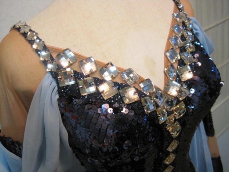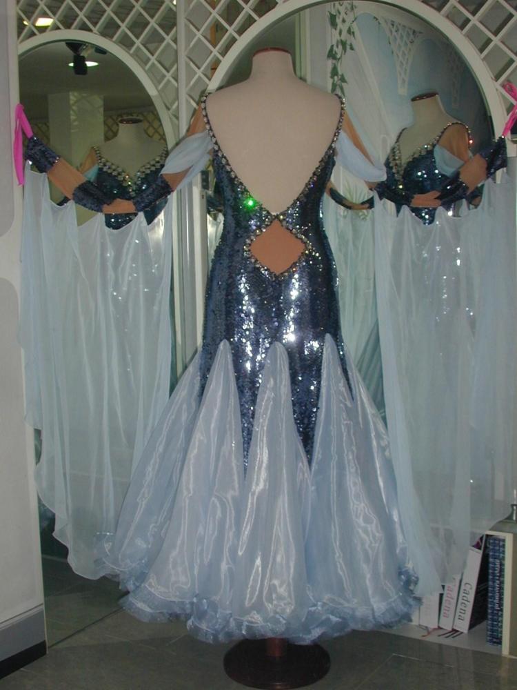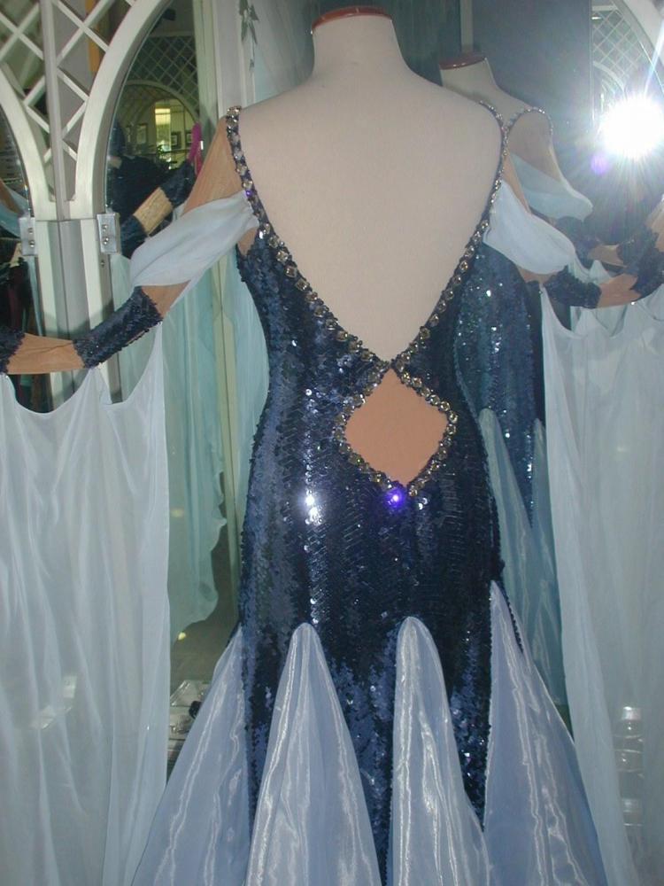 Centini Alta Modaのヨーロッパ選手のスポンサードレスです。紺色のスパン地とふんだんに使用した縫い付け石で大変フロアで輝くドレスです。バックのデザインも後ろ姿にインパクトを与えています。スカートは1枚目〜3枚目がオーガンジー、4枚目が濃い水色のジョーゼットとなっており、踊ると中の色が見えて色のコントラストが美しく大変軽くよく踊るドレスです。是非本物のイタリアのドレスの着心地をお試し下さい。ドレスはイタリアのアトリエで手入れを済ませ大変良い状態です。