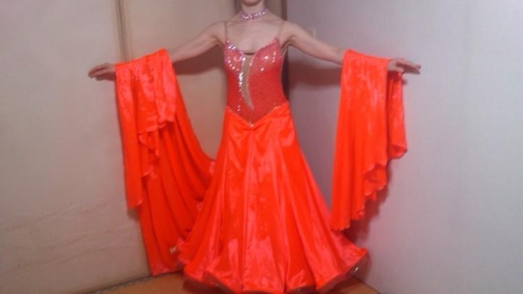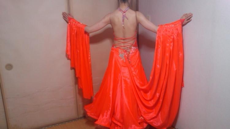 ボリュームのあるドレスなので、少し動いただけでも大きく躍って見えます。蛍光色で光沢のある素材なので、華やかで目立ちます。