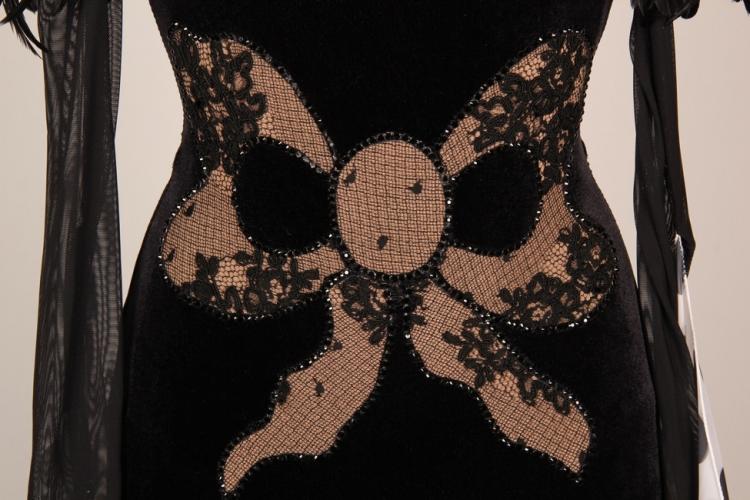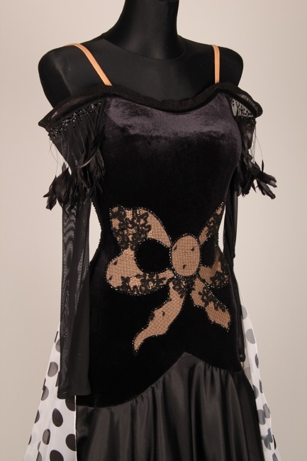 ボディにメッシュのリボンの模様が入った黒のドレスです。袖はオフショルダーになっていてフロートは白地に黒のドット柄で可愛らしいイメージのドレスになっています。