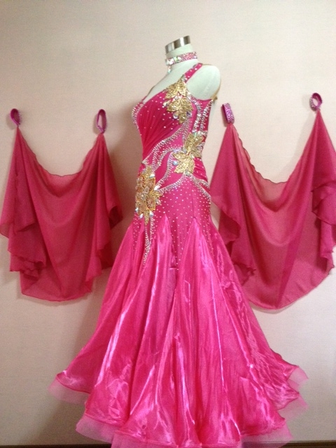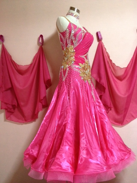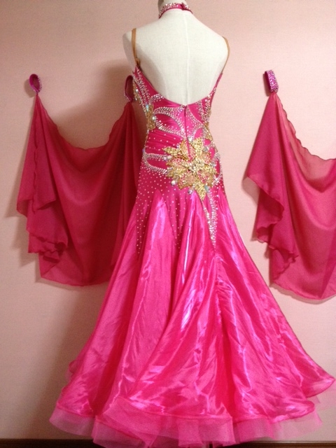 ラズベリーと金の組み合わせで豪華なドレスです。全身大量プレシオサ製ラインストーンを使用しとてもキラキラと光ります。またゴールドのモチーフの上にスワロスキーのカラーストーンを載せ、非常に存在感があります。ラッフルまでホースヘアを付いています。