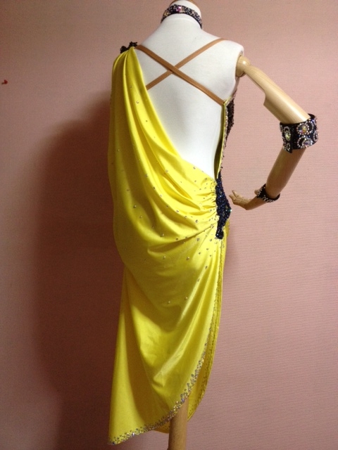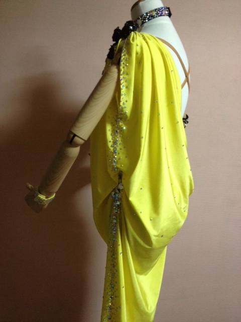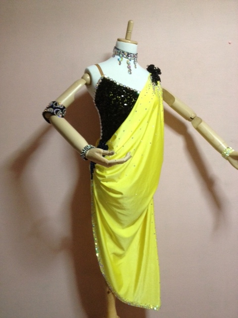 黄色と黒のスパンコールのデザインで大人っぽい印象のドレスです。首の一周とモチーフの周りに大量大きなラインストーンを使ってとても豪華です。チョーカー、腕輪3つ、予備ラインストーン付きです。
