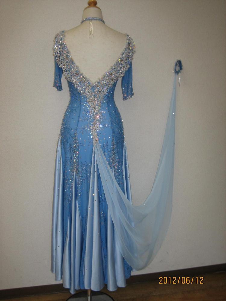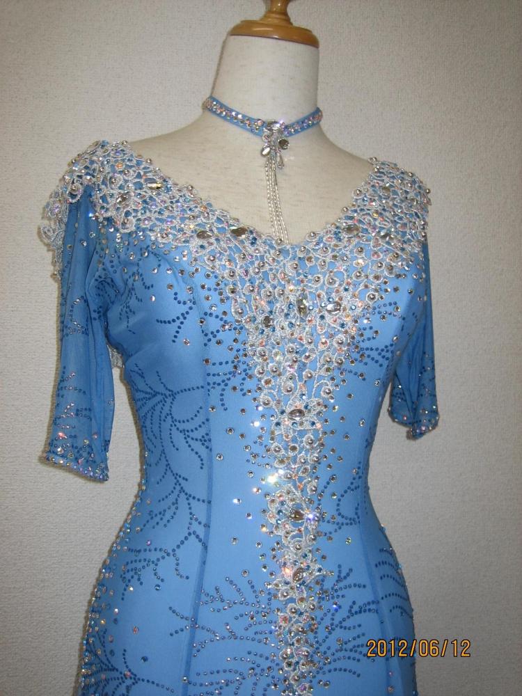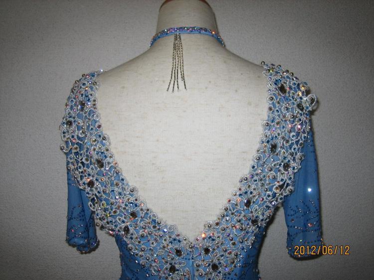 胸元のシルバーレースが豪華で、スワロスキーがたっぷり付いています。ボディーに伸縮性があり踊りやすく、お袖があるので安心です。イヤリング、ドレスバック付き。