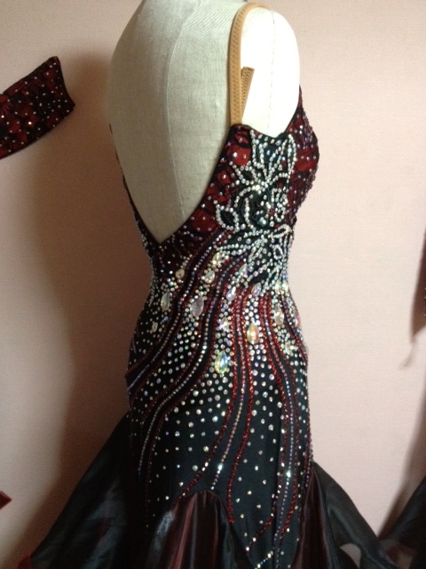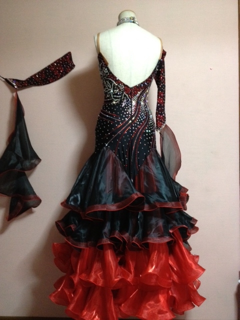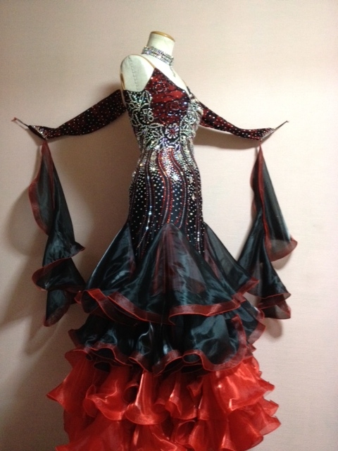 黒と赤の色合いがとても目立ち、綺麗です。全身大量のスワロフスキーとプレシオサ製ラインストーンを使用していて、大変お買いお得なドレスです。