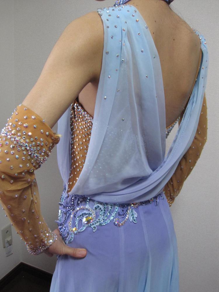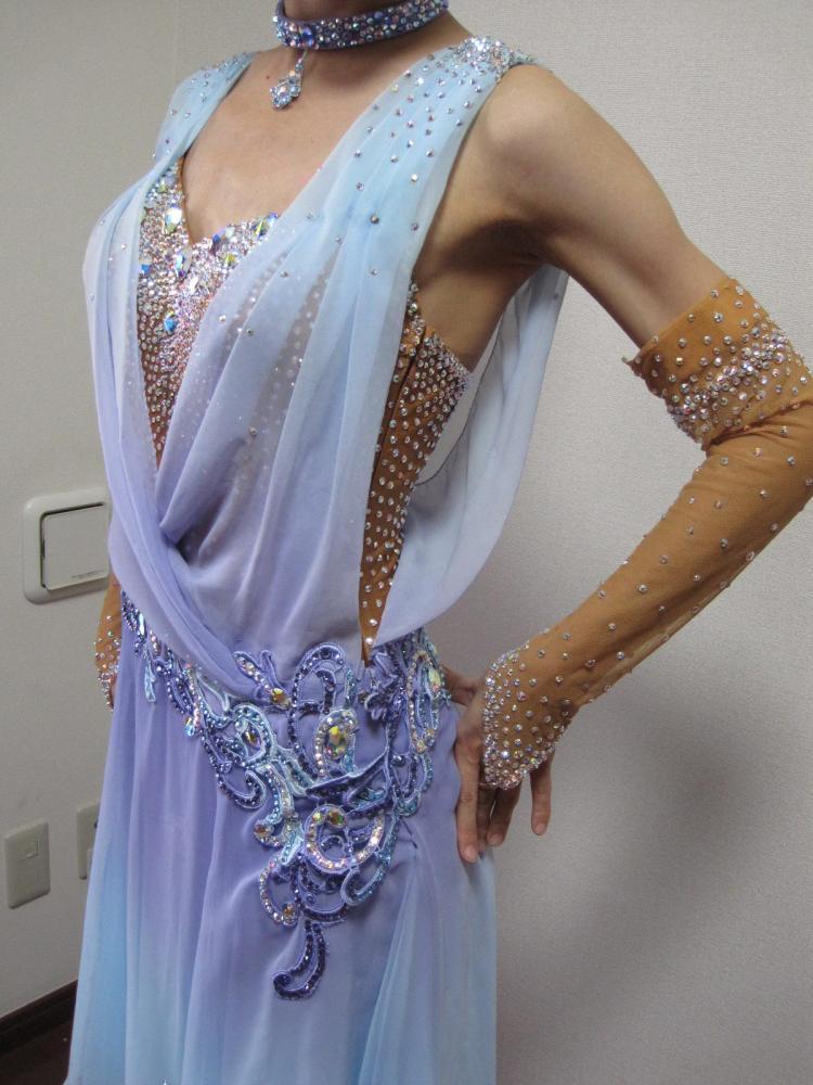 ブルーとパープルのグラデーションが美しいラテンドレスです。ボディ部分はベージュでラインストーンがたくさんついています。腰周りにも上品なモチーフが付いていてラインストーンがついています。ラインストーンがたくさんついた手袋、チョーカー付き。※かなり小さめで腰まわりはストレッチしません。