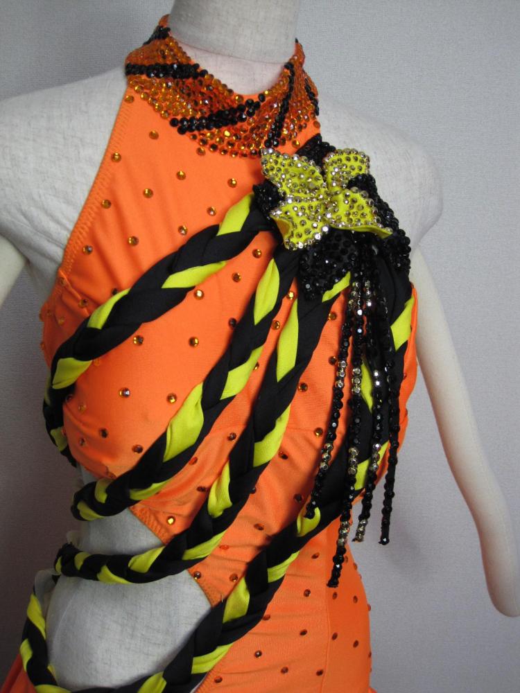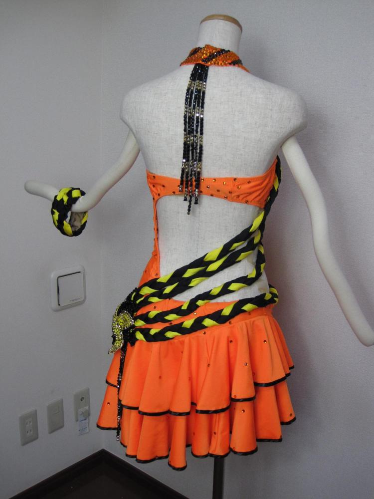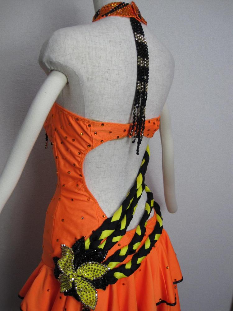 21万円でオーダーメイドしたドレスです。オレンジと黄と黒の可愛らしいドレス。スカート部分は2段のティアードになってます。左胸、左おしり部分に大きな花のモチーフがついています。