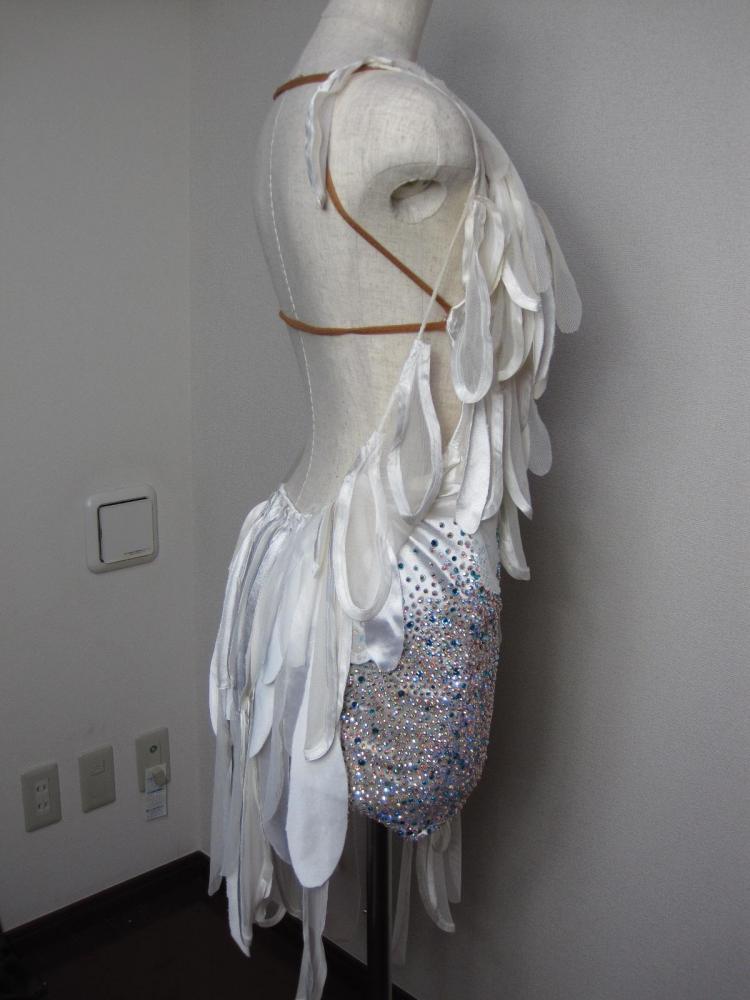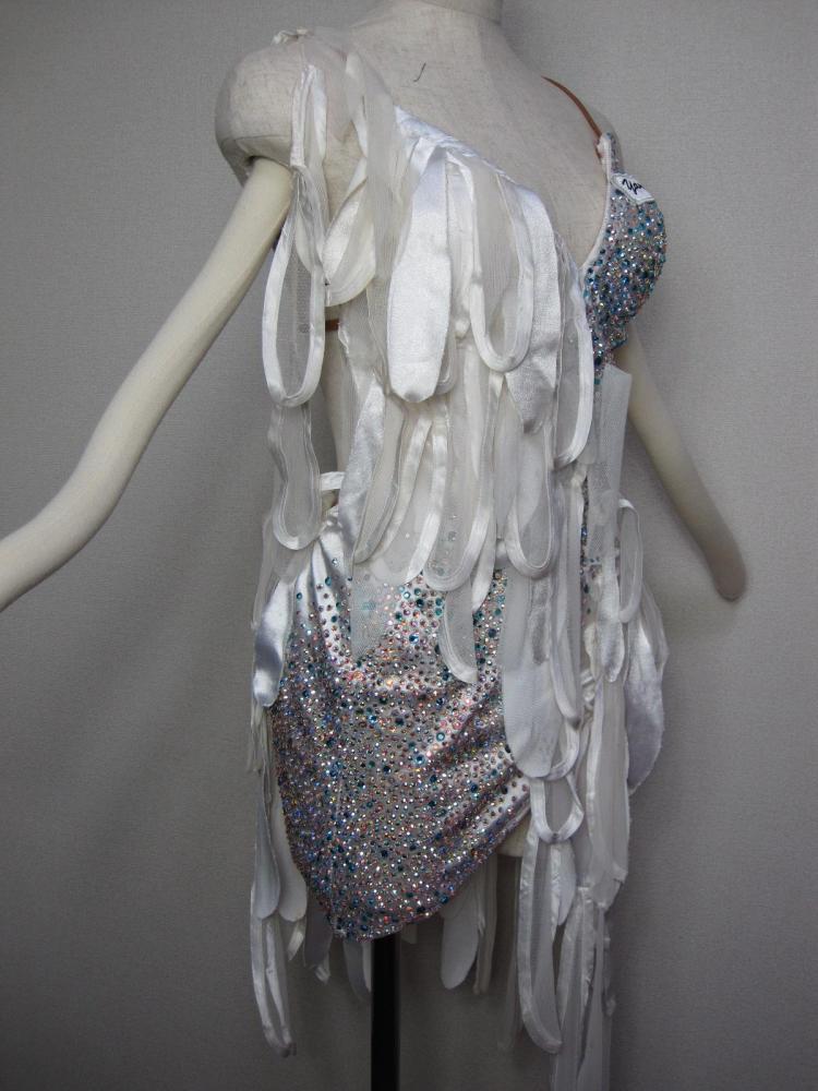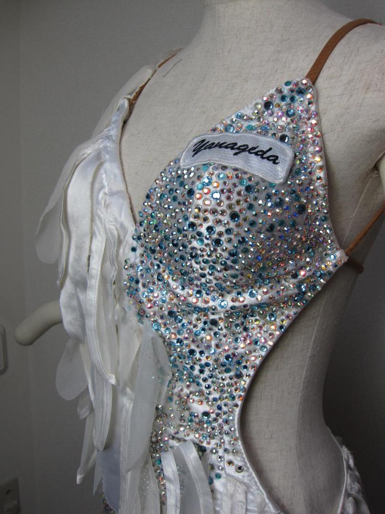 ヤナギダの白のラテンドレスです。カットされた布がたくさん垂れ下がっていて、踊ると舞います。ボディ部分にはたくさんの青系のストーンがびっしりと貼られています。