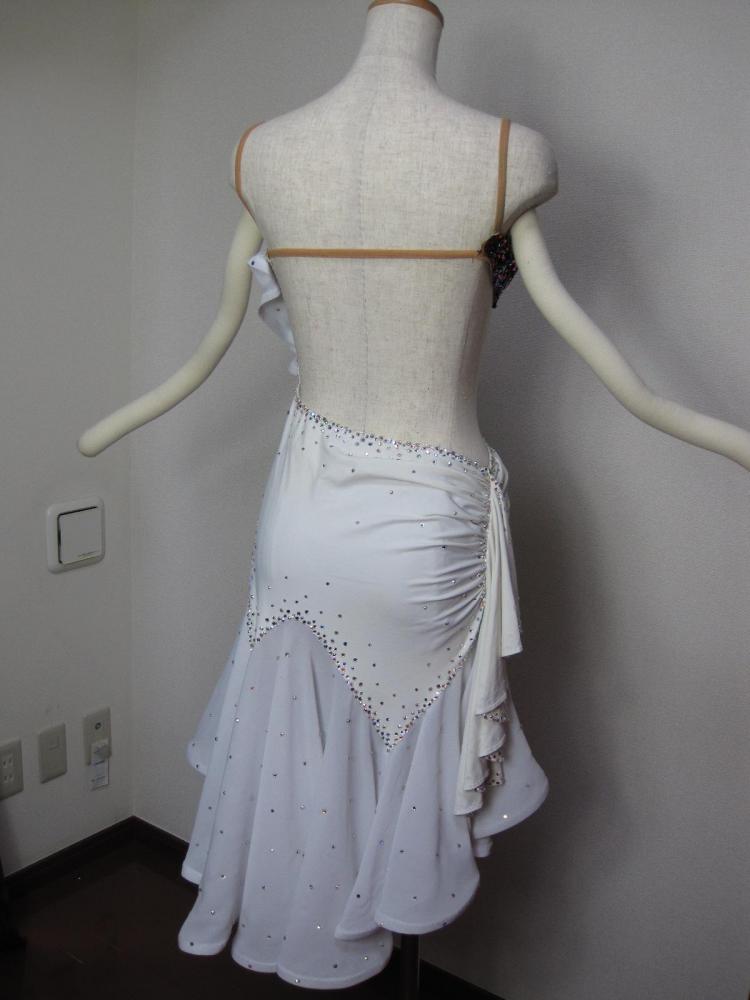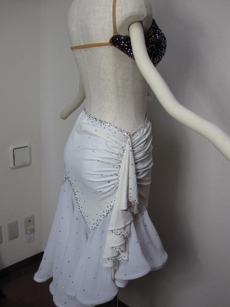 白のスカートはアシンメトリーになっていて右側にギャザーが寄っていてかわいいです。スカートの下の部分は切り返しが入っていてよく振れます。右の胸元は石がびっしり貼ってあります。