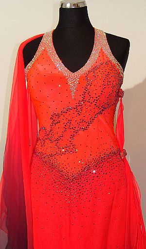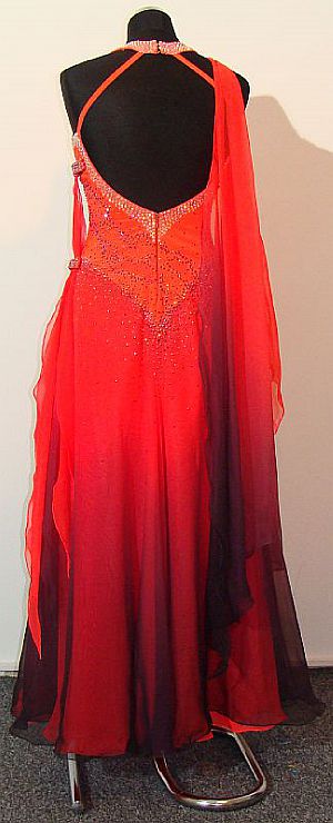 赤から黒のグラデーションになっているようなドレスです。襟元とボディにはたくさんのラインストーンがちりばめられています。