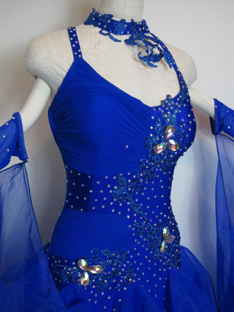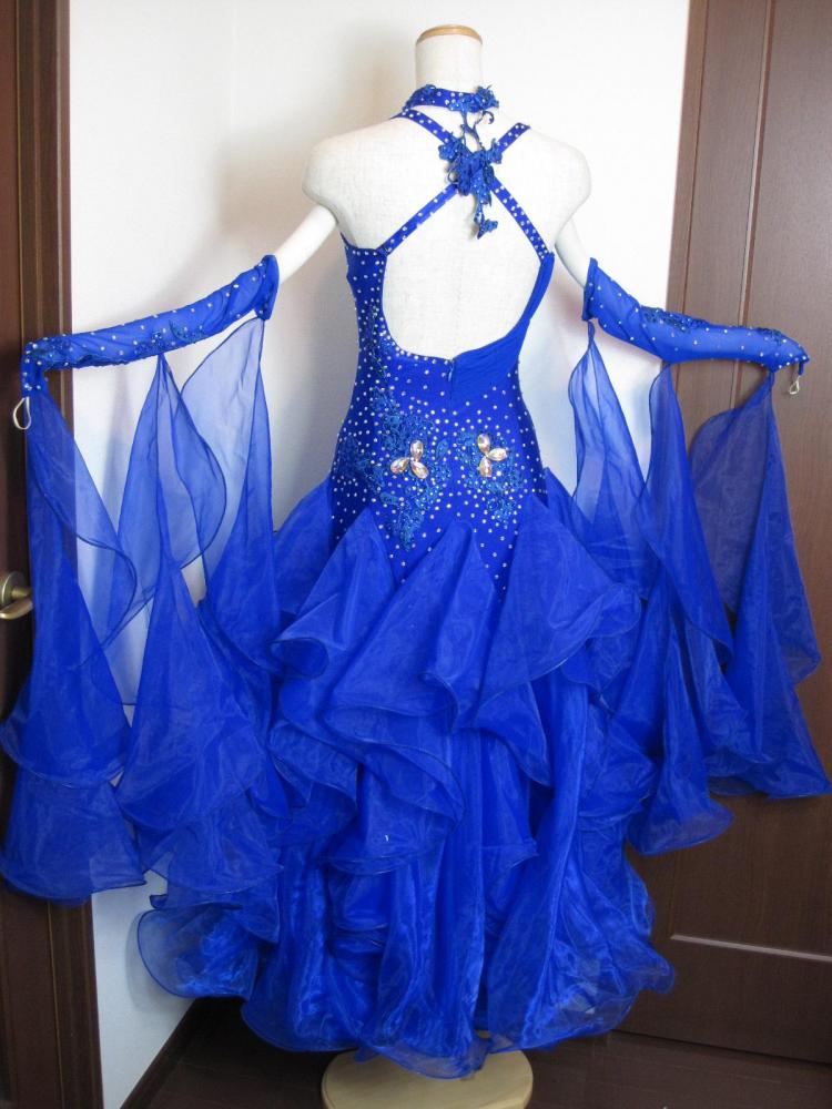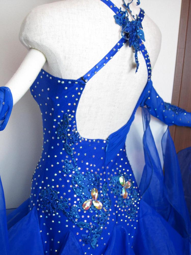 青色のボリューミーなドレスです。ボディやネックレスにはモチーフが使われ、石が貼られています。背中の紐は×になるようになっていて背中が締まって見えます。