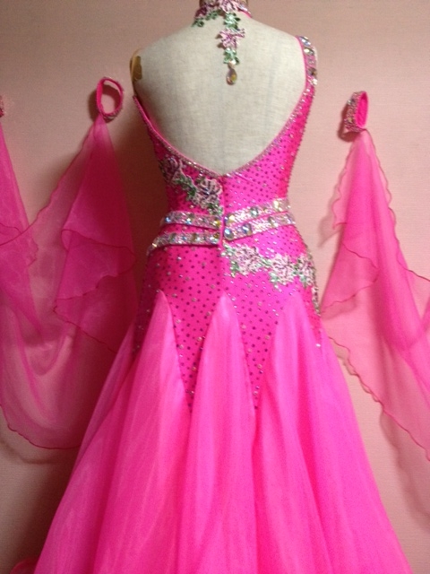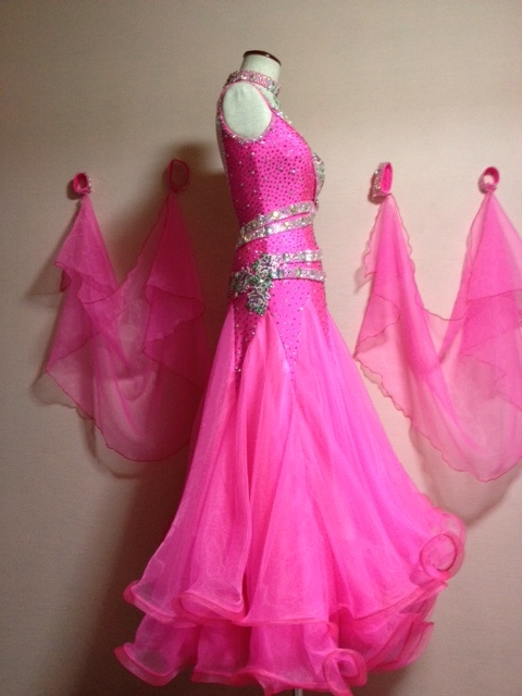 スカ ートからラッフルまで全部ホースヘアーがついているため、すごくボリュームがあってよく踊ります。ボディーもたくさんのラインストーン使用してあり、とても豪華なドレスです。